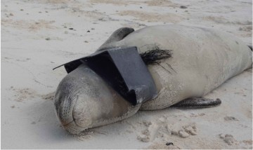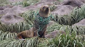 Last attempts to crawl its way onto the rocks! A Seal trapped by netting cutting its body while swimming for food.