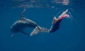 A Whale’s fluke severely mangled with netting, cork, barbs:  Divers work to free the whale from certain death.