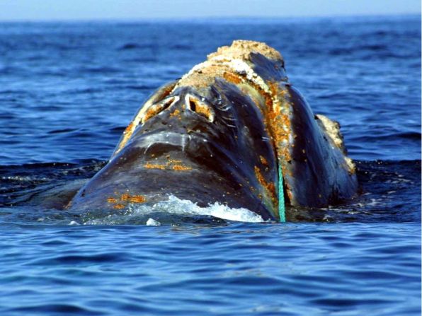 This file photo taken on June 19, 2001 by the National Oceanic and Atmospheric Administration shows an endangered North Atlantic Right Whale Atlantic Ocean. / AFP PHOTO /Getty Images. Canadian officials on August 11, 2017 ordered cargo and cruise ships to reduce their speed in the Gulf of Saint Lawrence in a bid to protect endangered whales. The move follows two months which saw an average of one North Atlantic right whale per week found dead in the shipping channel.